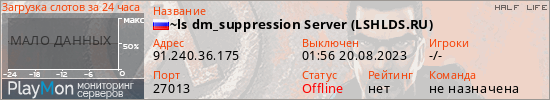 Общая информация ID: 53989 Ссылка: https://playmon.ru/server/91.240.36.175:27013 Адрес: 91.240.36.175:27013 Игроки: 0/16 Статус: Выключен Владелец: Не определён