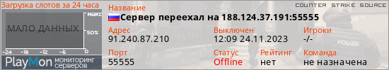 Сервер переехал на 188.124.37.191:55555 представлен в виде сервера ксс. Из всех имеющихся на сайте модификаций игровых серверов, вам может понравиться AWP серверы css. А для быстрой навигации по всем меткам - используйте главную страницу игры Counter Strike Source.