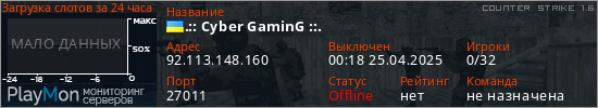 .:: Cyber GaminG ::. представлен в виде сервера кс 1.6. Из всех имеющихся на сайте модификаций игровых серверов, вам может понравиться Hide'n'Seek серверы cs. А для быстрой навигации по всем меткам - используйте главную страницу игры Counter Strike 1.6.