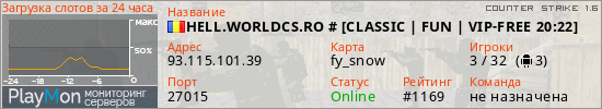 HELL.WORLDCS.RO # [CLASSIC | FUN | VIP-FREE 20:22] представлен в виде сервера кс 1.6. Из всех имеющихся на сайте модификаций игровых серверов, наша система поставила метку Classic сервера cs. В нашем мониторинге игровых серверов вы так же можете найти быструю навигацию по всем меткам - используйте главную страницу игры Counter Strike 1.6.