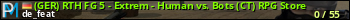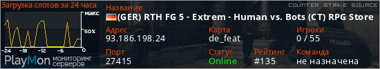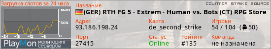 (GER) RTH FG 5 - Extrem - Human vs. Bots (CT) RPG Store представлен в виде сервера ксс. Из всех имеющихся на сайте модификаций игровых серверов, наша система поставила метку RPG сервера css. В нашем мониторинге игровых серверов вы так же можете найти быструю навигацию по всем меткам - используйте главную страницу игры Counter Strike Source.