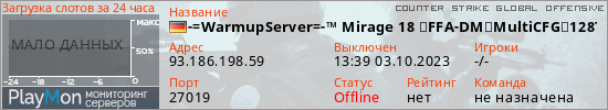 -=WarmupServer=-™ Mirage 18 ★FFA-DM★MultiCFG★128T★ представлен в виде сервера кс го. Из всех имеющихся на сайте модификаций игровых серверов, наша система поставила метку DeathMatch сервера csgo. В нашем мониторинге игровых серверов вы так же можете найти где поиграть на FFA сервере кс го.