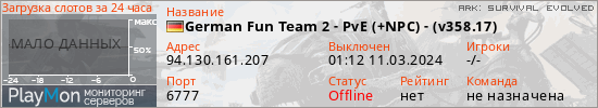 Общая информация ID: 46956 Ссылка: https://playmon.ru/server/94.130.161.207:6777 Адрес: 94.130.161.207:6777 Игроки: 0/70 Статус: Выключен Владелец: Не определён