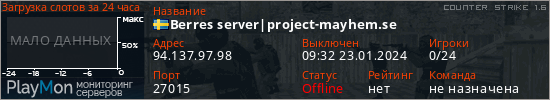 Berres server|project-mayhem.se представлен в виде сервера кс 1.6. Из всех имеющихся на сайте модификаций игровых серверов, вам может понравиться Hide'n'Seek серверы cs. А для быстрой навигации по всем меткам - используйте главную страницу игры Counter Strike 1.6.