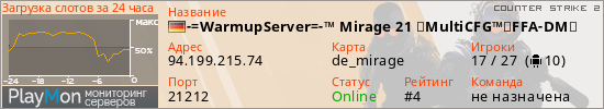 -=WarmupServer=-™ Mirage 21 ★MultiCFG™★FFA-DM★ представлен в виде сервера кс 2. Из всех имеющихся на сайте модификаций игровых серверов, наша система поставила метку DeathMatch сервера cs2. В нашем мониторинге игровых серверов вы так же можете найти где поиграть на FFA сервере кс 2.