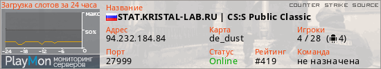 STAT.KRISTAL-LAB.RU | CS:S Public Classic представлен в виде сервера ксс. Из всех имеющихся на сайте модификаций игровых серверов, наша система поставила метку Classic сервера css. В нашем мониторинге игровых серверов вы так же можете найти быструю навигацию по всем меткам - используйте главную страницу игры Counter Strike Source.