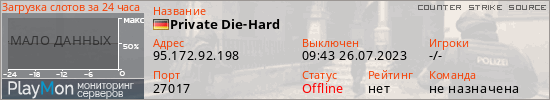 Private Die-Hard представлен в виде сервера ксс. Из всех имеющихся на сайте модификаций игровых серверов, вам может понравиться AWP серверы css. А для быстрой навигации по всем меткам - используйте главную страницу игры Counter Strike Source.