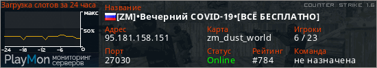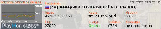 [ZM]•Вечерний COVID-19•[ВСЁ БЕСПЛАТНО] представлен в виде сервера кс 1.6. Из всех имеющихся на сайте модификаций игровых серверов, наша система поставила метку Zombie сервера cs. В нашем мониторинге игровых серверов вы так же можете найти быструю навигацию по всем меткам - используйте главную страницу игры Counter Strike 1.6.