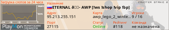 ETERNAL 🍭 AWP [!ws !shop !vip !bp] представлен в виде сервера кс 2. Из всех имеющихся на сайте модификаций игровых серверов, наша система поставила метку AWP сервера cs2. В нашем мониторинге игровых серверов вы так же можете найти быструю навигацию по всем меткам - используйте главную страницу игры Counter Strike 2.