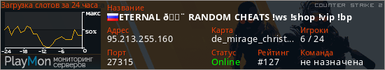 ETERNAL 🍨 RANDOM CHEATS !ws !shop !vip !bp представлен в виде сервера кс 2. Из всех имеющихся на сайте модификаций игровых серверов, вам может понравиться Retake серверы cs2. А для быстрой навигации по всем меткам - используйте главную страницу игры Counter Strike 2.