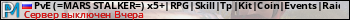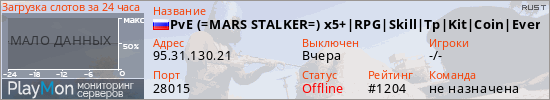 PvE (=MARS STALKER=) x5+|RPG|Skill|Tp|Kit|Coin|Events|RaidBase| представлен в виде сервера раст. Из всех имеющихся на сайте модификаций игровых серверов, наша система поставила метку PvE сервера rust. В нашем мониторинге игровых серверов вы так же можете найти быструю навигацию по всем меткам - используйте главную страницу игры Rust.
