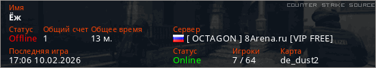 Играет на Counter Strike Source сервере. Страна: РоссияПервый раз замечен 11:55 09.02.2026