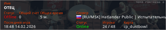 Играет на Team Fortress 2 сервере. Страна: РоссияПервый раз замечен 18:46 14.02.2026
