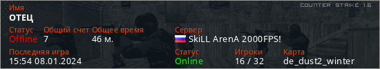 Последний раз был в сети 15:54 08.01.2024 Игрок с таким ником замечен на 32 серверах