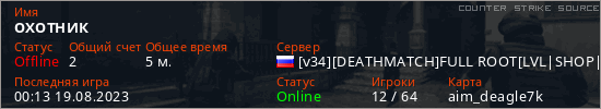 Играет на Counter Strike Source сервере. Страна: РоссияПервый раз замечен 00:11 19.08.2023