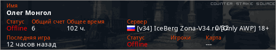 Играет на Counter Strike Source сервере. Страна: РоссияПервый раз замечен 22:45 05.01.2026