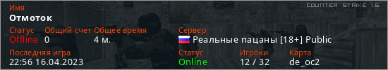 Играет на Counter Strike 1.6 сервере. Страна: РоссияПервый раз замечен 22:50 16.04.2023