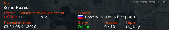Играет на Counter Strike 1.6 сервере. Страна: РоссияПервый раз замечен 01:59 03.01.2026