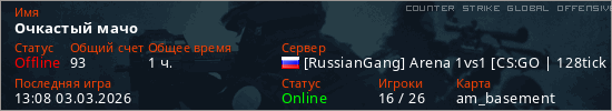 Играет на Counter Strike Global Offensive сервере. Страна: РоссияПервый раз замечен 16:12 13.02.2026