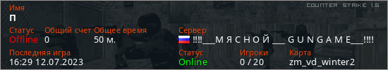 Играет на Counter Strike 1.6 сервере. Страна: РоссияПервый раз замечен 16:15 12.07.2023