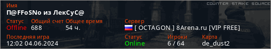 Играет на Counter Strike Source сервере. Страна: РоссияПервый раз замечен 10:27 25.01.2022