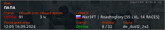 Последний раз был в сети 12:05 16.09.2024 Игрок с таким ником замечен на 32 серверах