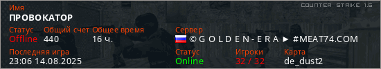 Играет на Counter Strike 1.6 сервере. Страна: РоссияПервый раз замечен 16:39 16.06.2024