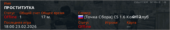 Играет на Counter Strike 1.6 сервере. Страна: РоссияПервый раз замечен 20:14 18.02.2026