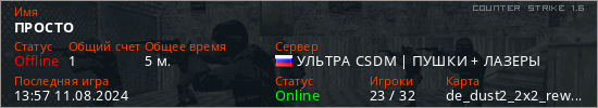 Играет на Counter Strike 1.6 сервере. Страна: РоссияПервый раз замечен 13:53 11.08.2024