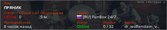 Играет на Team Fortress 2 сервере. Страна: РоссияПервый раз замечен 17:12 16.03.2026