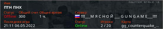 Играет на Counter Strike 1.6 сервере. Страна: РоссияПервый раз замечен 18:38 20.04.2022