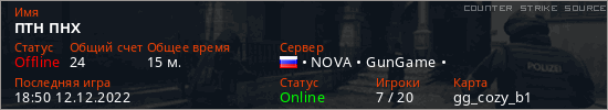 Играет на Counter Strike Source сервере. Страна: РоссияПервый раз замечен 18:38 12.12.2022