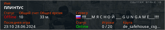 Играет на Counter Strike 1.6 сервере. Страна: РоссияПервый раз замечен 18:31 26.06.2024