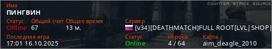 Играет на Counter Strike Source сервере. Страна: РоссияПервый раз замечен 20:05 15.10.2025