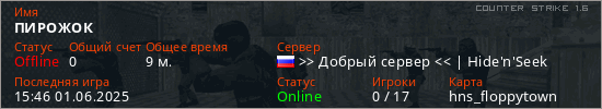 Играет на Counter Strike 1.6 сервере. Страна: РоссияПервый раз замечен 18:17 18.05.2025
