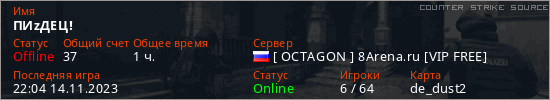 Играет на Counter Strike Source сервере. Страна: РоссияПервый раз замечен 21:06 23.02.2020