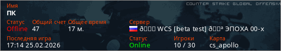 Играет на Counter Strike Global Offensive сервере. Страна: РоссияПервый раз замечен 08:49 13.02.2026