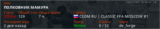 Играет на Counter Strike 1.6 сервере. Страна: РоссияПервый раз замечен 09:53 12.02.2026