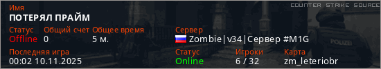 Играет на Counter Strike Source сервере. Страна: РоссияПервый раз замечен 23:58 09.11.2025
