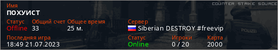 Играет на Counter Strike Source сервере. Страна: РоссияПервый раз замечен 19:51 09.03.2023