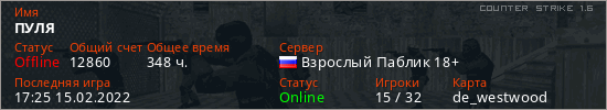 Играет на Counter Strike 1.6 сервере. Страна: РоссияПервый раз замечен 16:44 19.01.2020