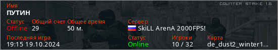 Играет на Counter Strike 1.6 сервере. Страна: РоссияПервый раз замечен 17:05 19.10.2022