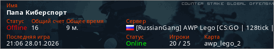 Играет на Counter Strike Global Offensive сервере. Страна: РоссияПервый раз замечен 21:48 27.01.2026