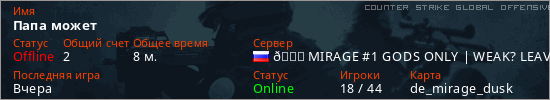 Играет на Counter Strike Global Offensive сервере. Страна: РоссияПервый раз замечен 17:16 24.03.2026
