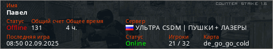 Последний раз был в сети 08:50 02.09.2025 Игрок с таким ником замечен на 24 серверах