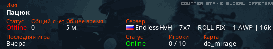 Играет на Counter Strike Global Offensive сервере. Страна: РоссияПервый раз замечен 16:55 10.03.2026