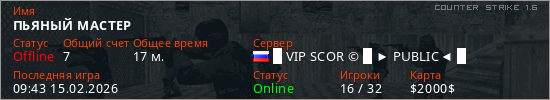 Играет на Counter Strike 1.6 сервере. Страна: РоссияПервый раз замечен 08:09 15.02.2026