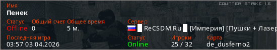 Играет на Counter Strike 1.6 сервере. Страна: РоссияПервый раз замечен 03:32 03.04.2026