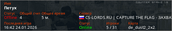 Играет на Counter Strike 1.6 сервере. Страна: РоссияПервый раз замечен 16:04 24.01.2026