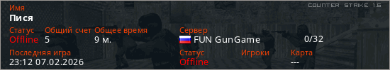 Играет на Counter Strike 1.6 сервере. Страна: РоссияПервый раз замечен 23:05 07.02.2026